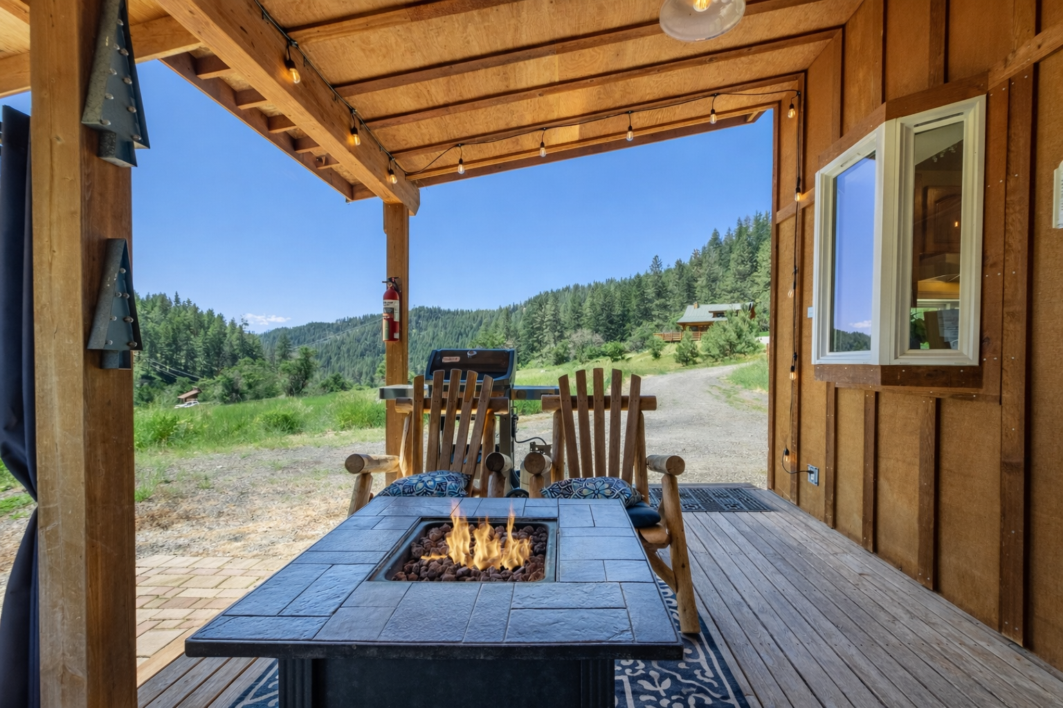 The porch is fantastic!!! Had a great time just relaxing in the hot tub next to the fire pit!!! Everything is easy to use and self lighting which makes it easy to truly relax and still enjoy the fire or pellet stove. The house did seem like it was still a work in progress it will be even nicer if the loft gets finished.