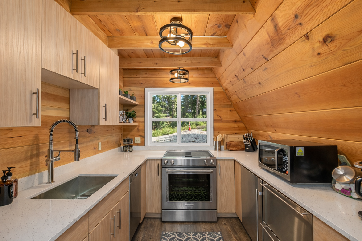 Super cozy cabin!! Bathroom and kitchen are both modern and impeccable. Kitchen was reasonably well stocked with spices and cooking tools. Only note is to bring eye shades for sleeping if you’re sensitive to light - there’s no curtains in the loft. Hot tub and fire pit were nice and cozy, and in warmer months there’s a cute lakeside picnic table area. Absolutely perfect for a weekend getaway.