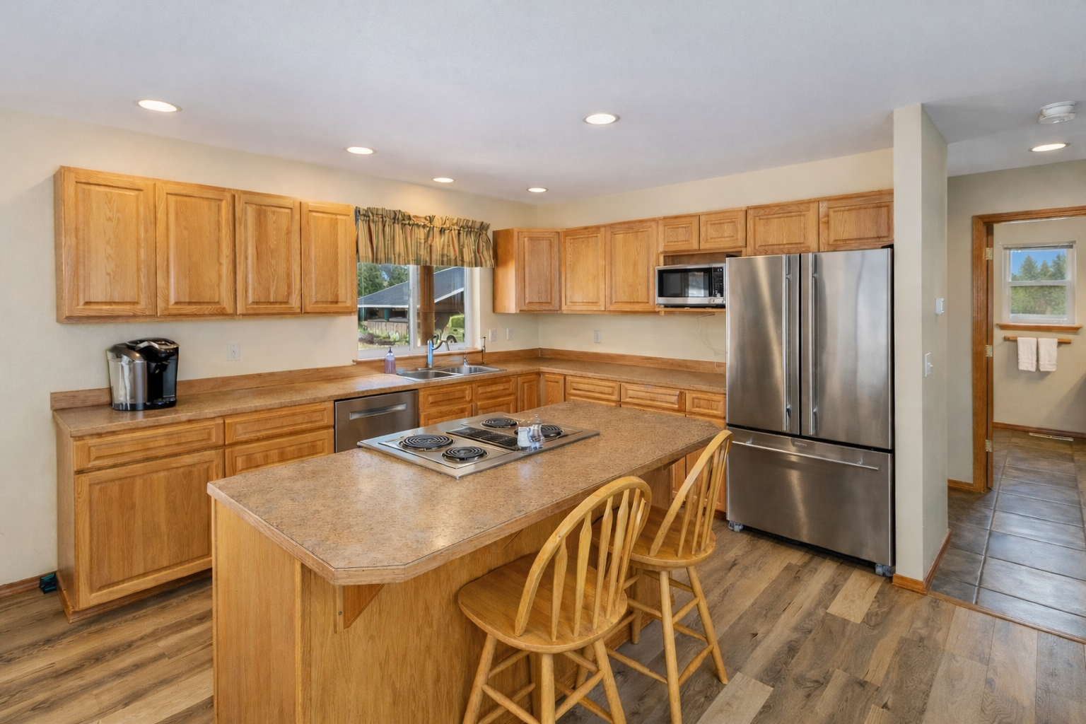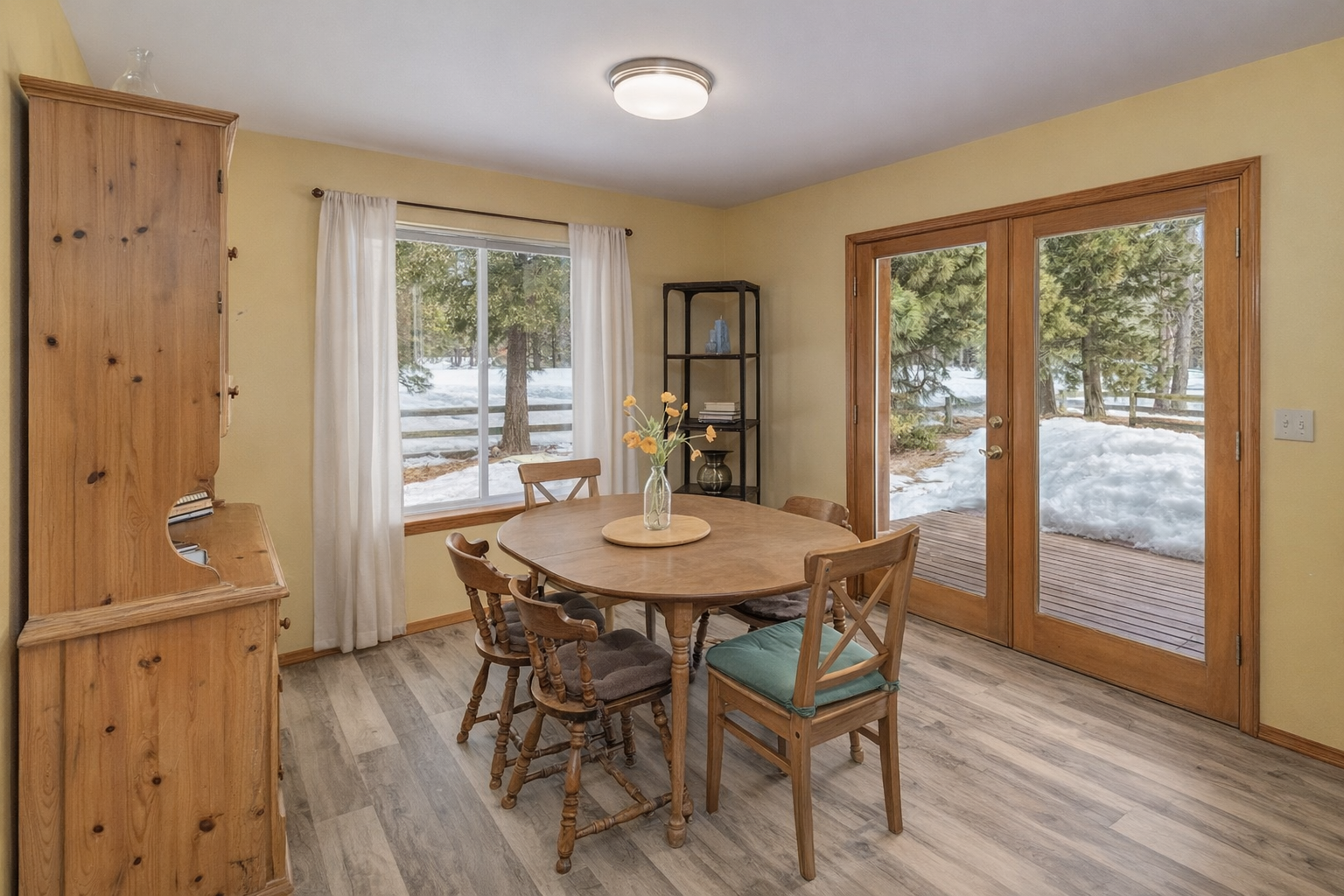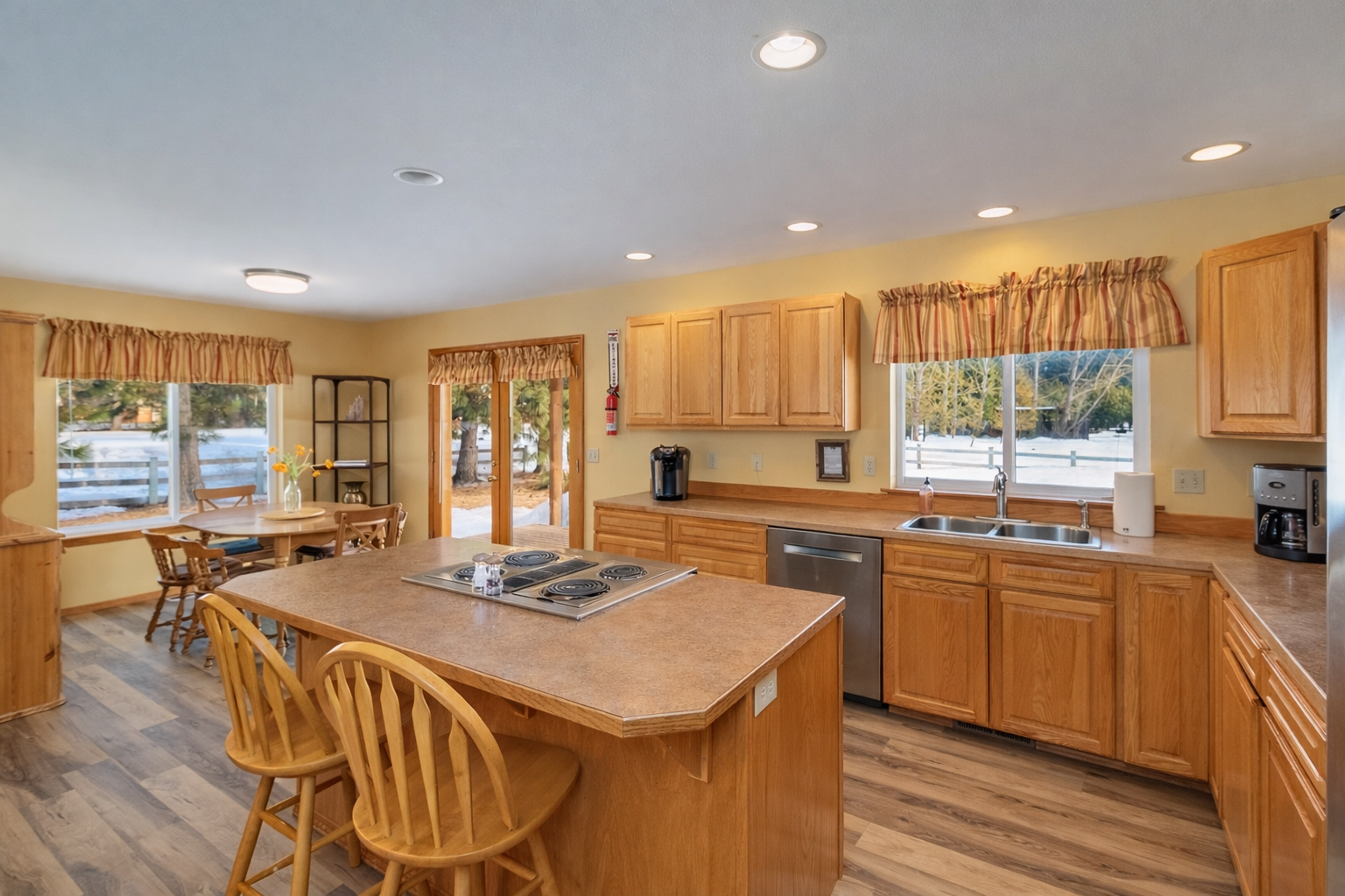 The fully equipped kitchen includes an electric range, dishwasher, and microwave, with ample space for preparing family meals. A dining table for six sits adjacent to the French doors that lead to the spacious back deck, giving you the option to dine indoors or out beneath the open sky.
