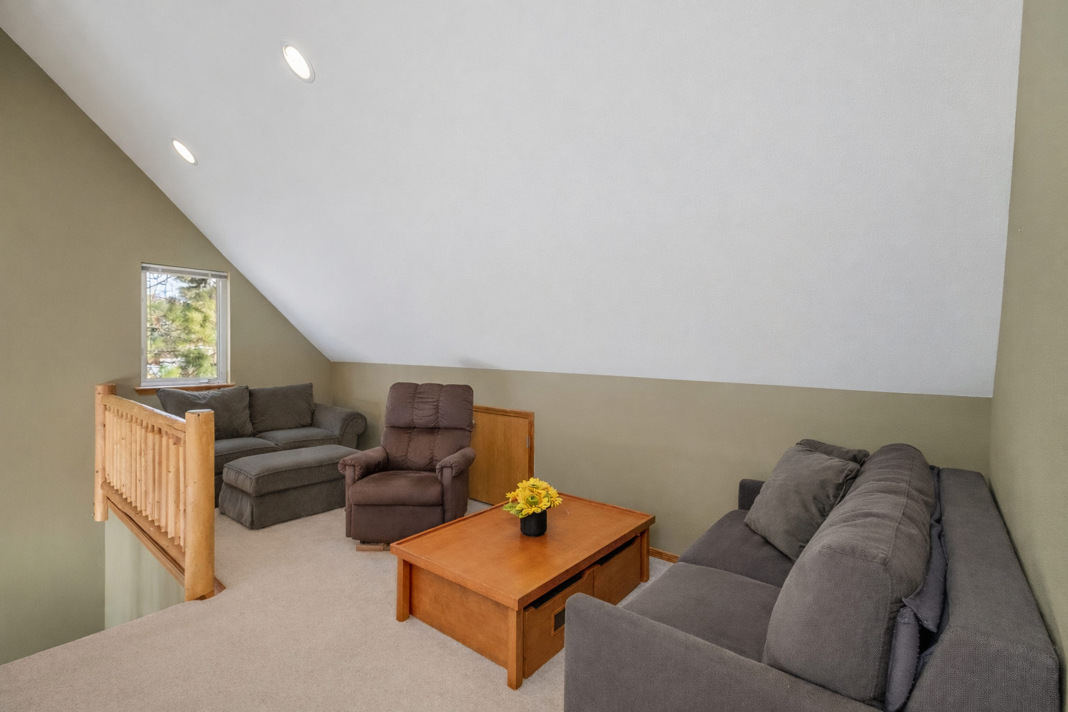 The great room welcomes you with cathedral ceilings, rustic knotty pine accents, and an open-concept layout perfect for relaxing or entertaining. Lounge on comfortable seating for six while enjoying the smart TV with streaming and DVD options. Upstairs, a lofted gathering area offers extra space for board games, reading, or quiet conversations.