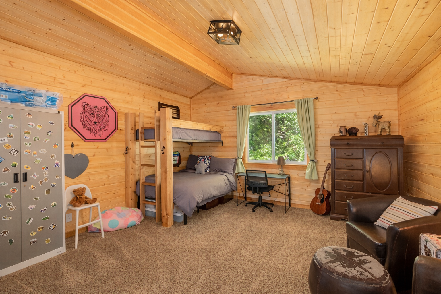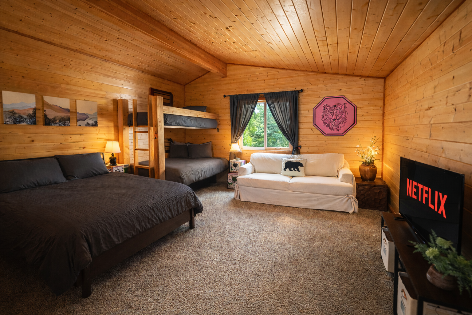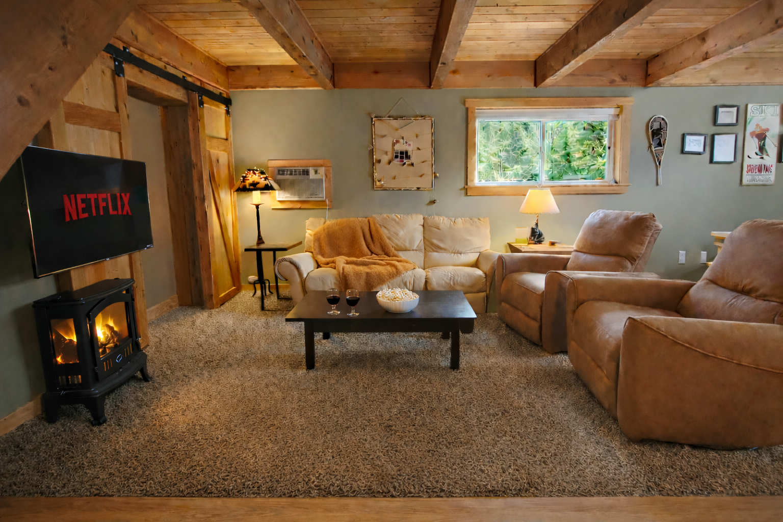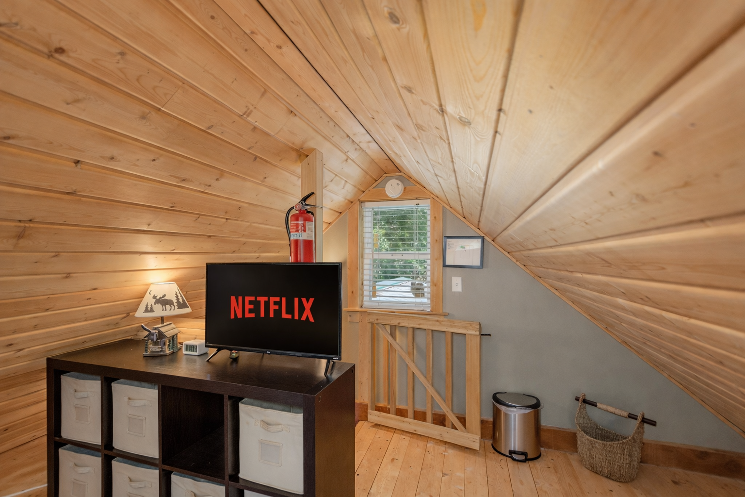 • Cozy queen bed tucked into the A-frame loft with rustic charm