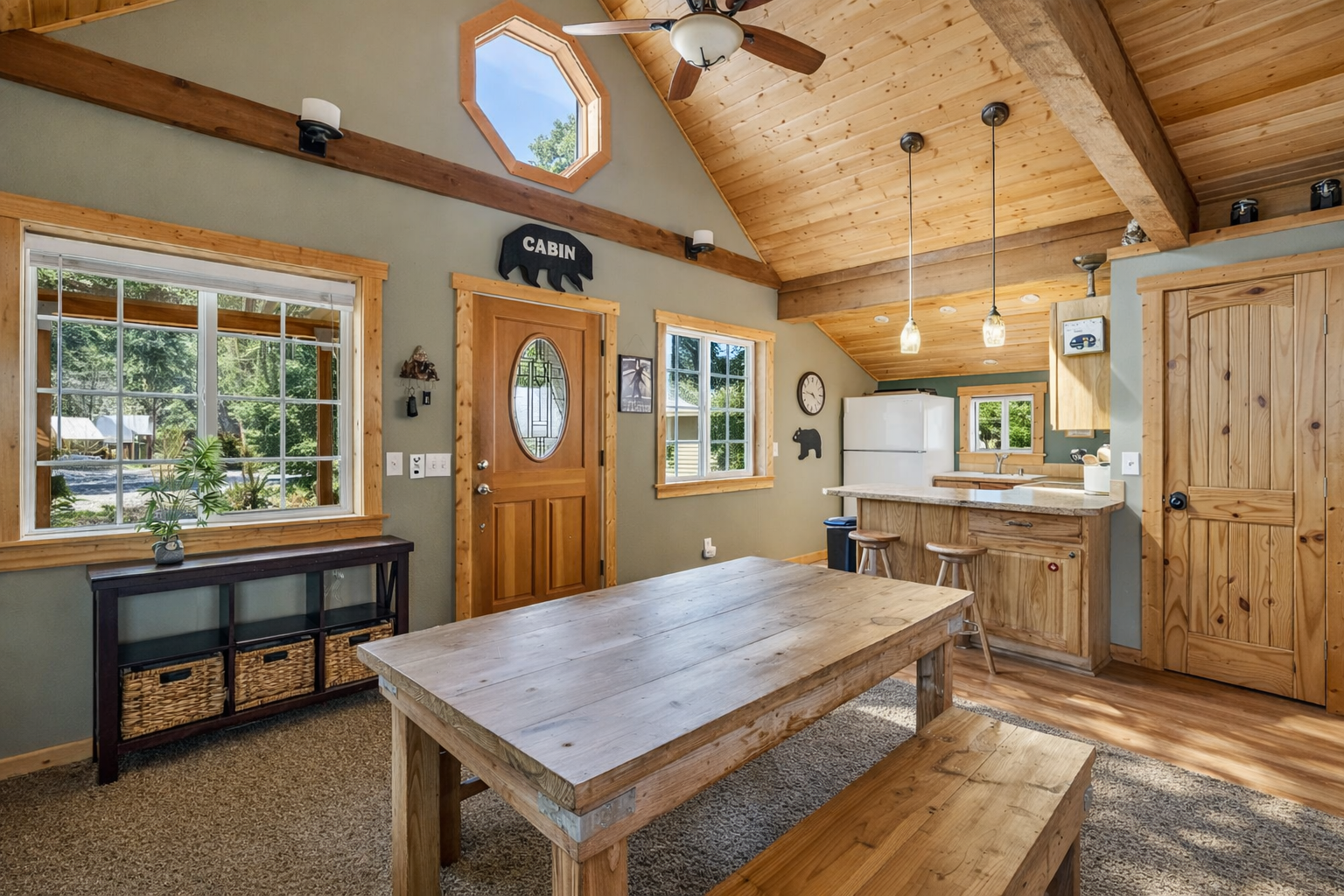 Large windows bring in soft natural light while the quiet wooded surroundings add to the cabin’s serene atmosphere.
