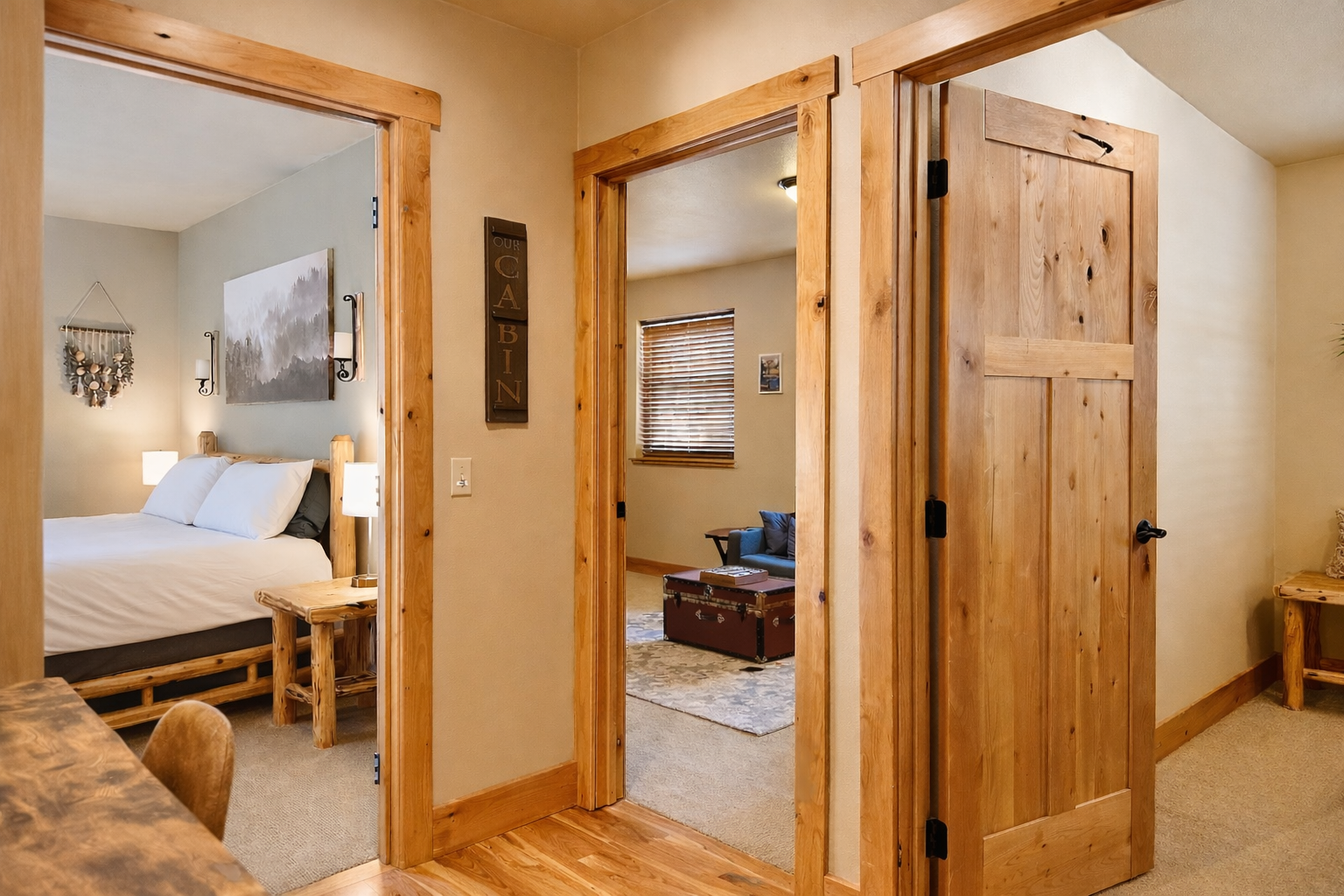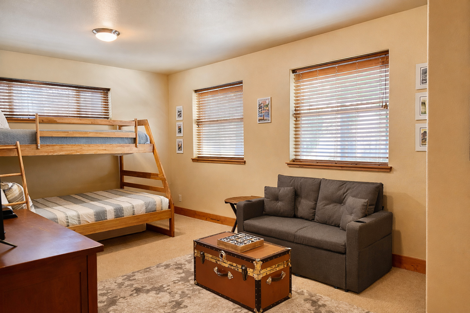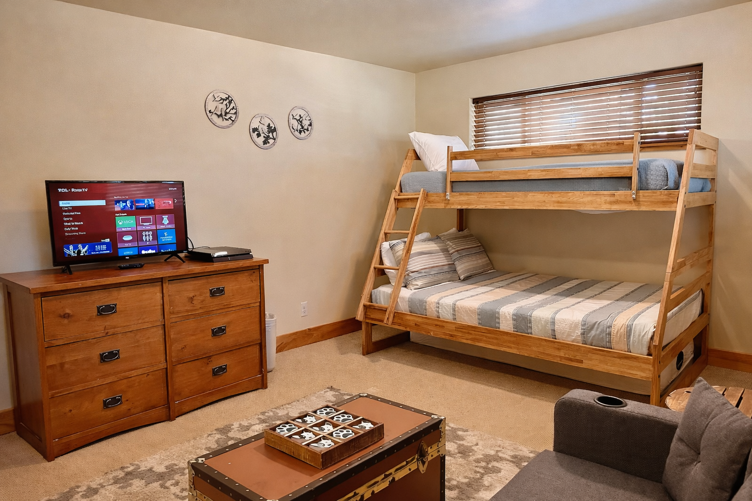 • Bunk Room: Twin-over-full bunk, smart TV, and lounge area with a small couch—ideal for kids or teens to hang out.