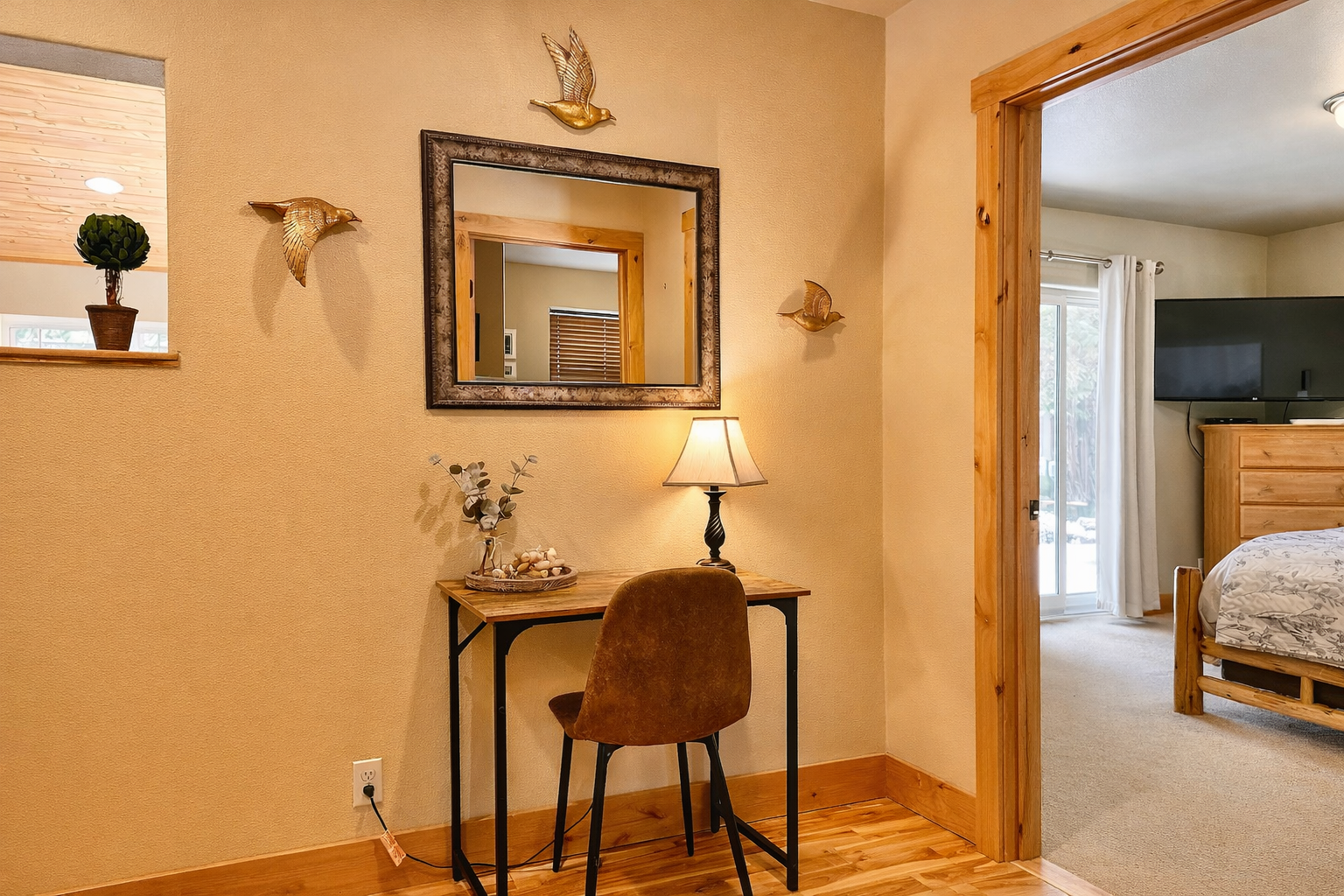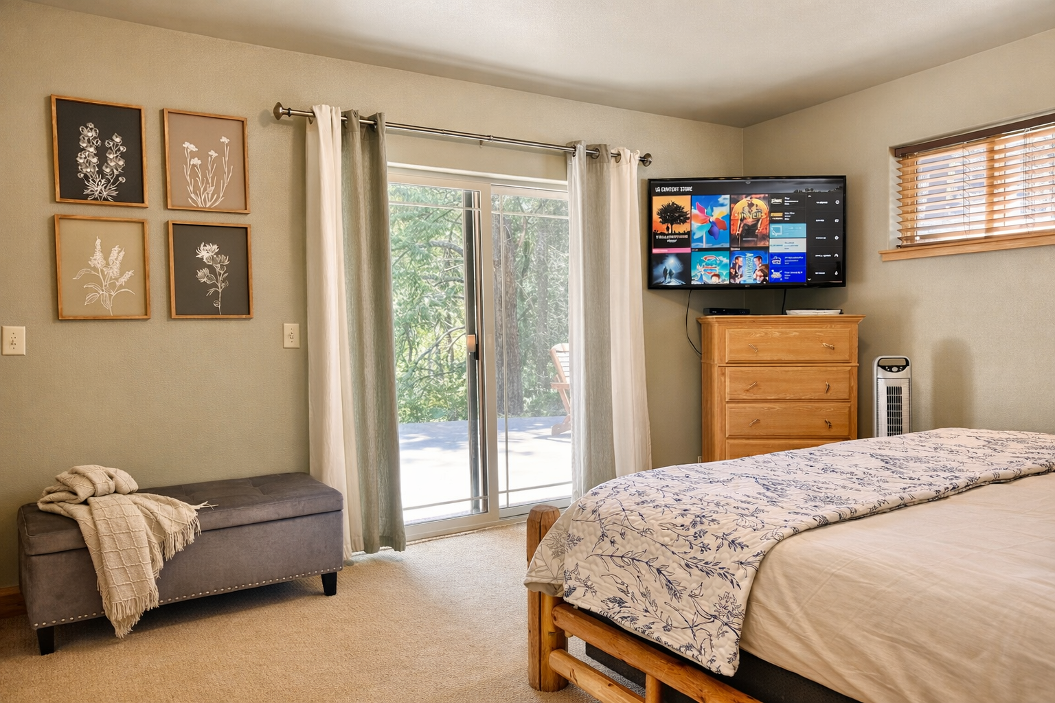 • Primary Bedroom: King bed, streaming TV, and private access to the back patio.