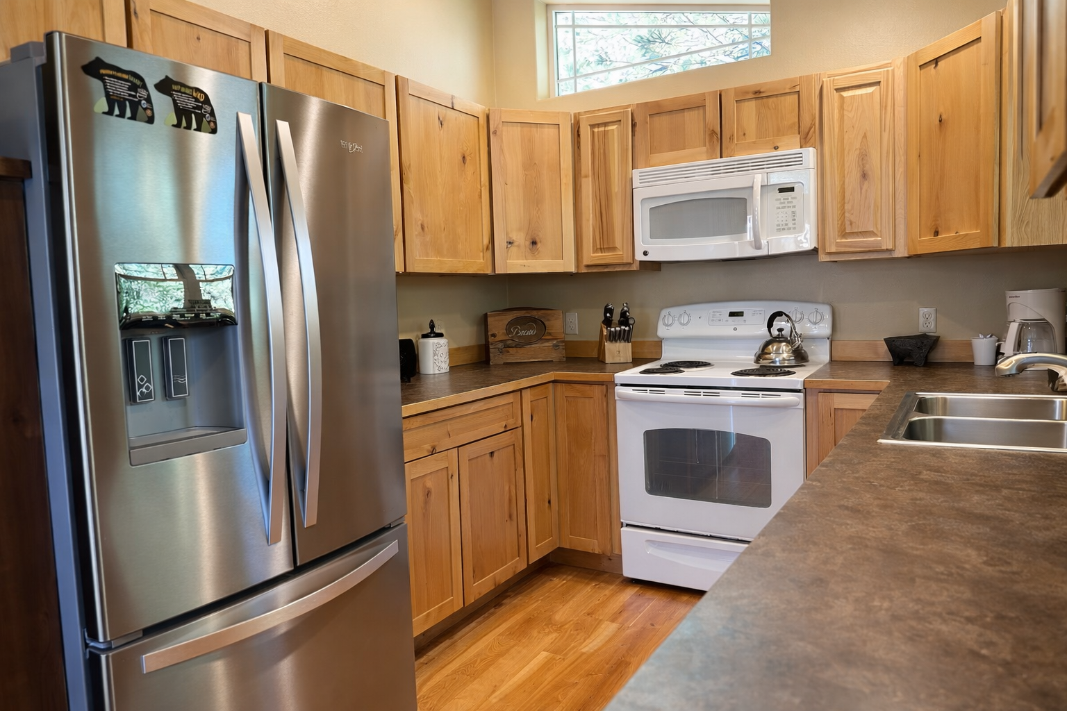 The fully stocked kitchen includes all major appliances, cookware, and utensils for preparing home-cooked meals. The adjoining dining area seats four and is perfect for shared meals and late-night card games.