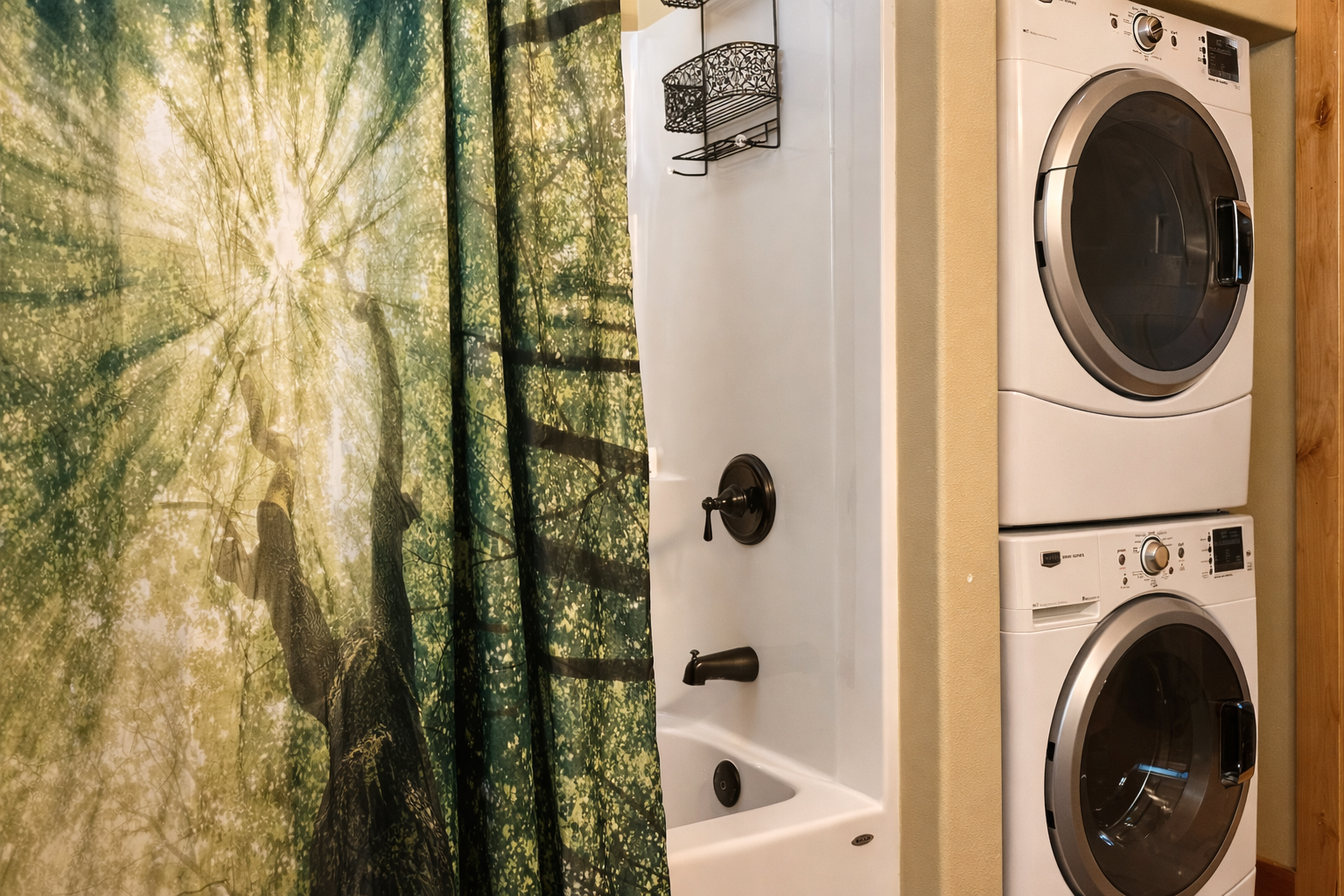 The full bathroom includes a tub/shower combo and a stackable washer/dryer unit, offering everything you need for longer stays.