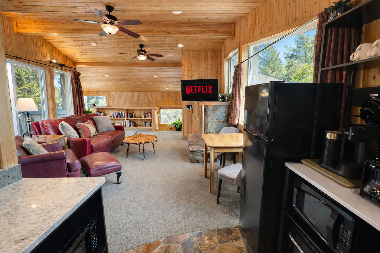 an apartment-sized refrigerator, toaster oven, microwave, electric tea kettle, Keurig, two-element hot plate, skillet, rice cooker, slow cooker, and toaster — everything you need to prepare meals during your remote work stay or getaway.